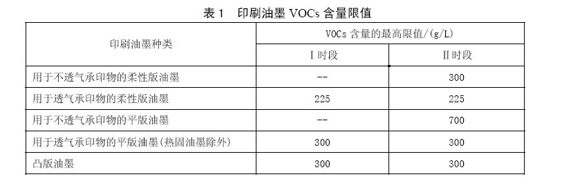 印刷企業生產過程中使用的印刷油墨VOCs含量限值(為處于即用狀態以每升油墨所含多少克VOCs計算)應執行表1的規定。
