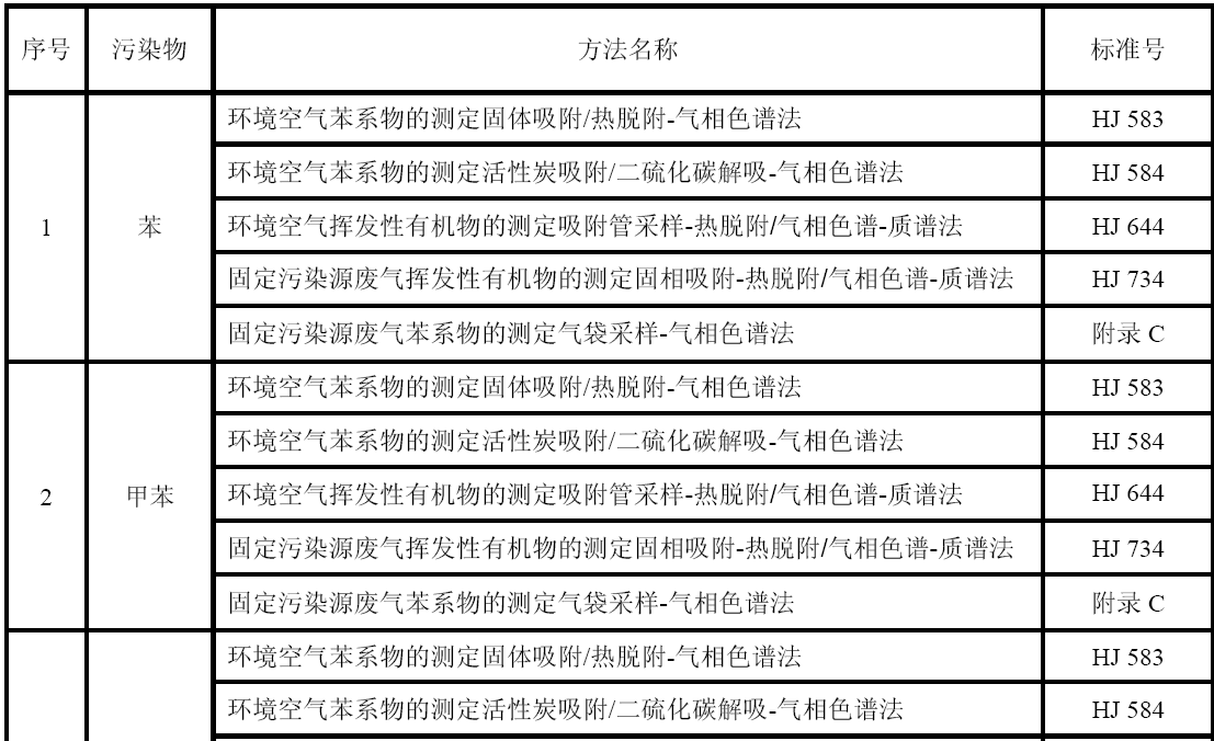 GB 16297 大氣污染物綜合排放標準 GB 24409 汽車涂料中有害物質限量 GB/T 15089 機動車輛及掛車分類 GB/T15432 環境空氣總懸浮顆粒物的測定重量法 GB/T 16157 固定污染源排氣中顆粒物測定與氣態污染物采樣方法 HJ 583 環境空氣苯系物的測定固體吸附/熱脫附-氣相色譜法 HJ 584 環境空氣苯系物的測定活性炭吸附/二硫化碳解吸-氣相色譜法 HJ 644 環境空氣揮發性有機物的測定吸附管采樣-熱脫附/氣相色譜-質譜法 HJ 732 固定污染源廢氣揮發性有機物的采樣氣袋法 HJ 734 固定污染源廢氣揮發性有機物的測定固相吸附-熱脫附/氣相色譜-質譜法 HJ/T 38 固定污染源排氣中非甲烷總烴的測定氣相色譜法 HJ/T 55 大氣污染物無組織排放監測技術導則 HJ/T 75 固定污染源煙氣排放連續監測技術規范(試行) HJ/T 194 環境空氣質量手工監測技術規范 HJ/T 293 清潔生產標準汽車制造業(涂裝) HJ/T 397 固定源廢氣監測技術規范 《建設項目環境保護設施竣工驗收監測技術要求(試行)》(環發(2000)38號)