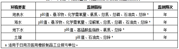 橡膠制品工業排污單位廢水排放監測點位、監測指標及最低監測頻次按照表1執行。