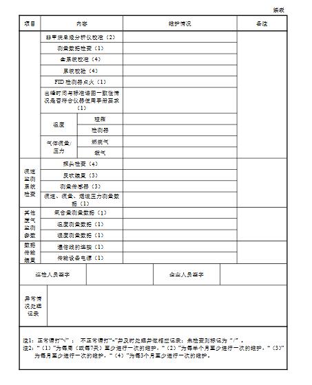 11.3定期維護維護頻次按照本標準附表E.1進行,定期維護應做到:a)使用氫氣鋼瓶時,至少每周巡檢一次鋼瓶氣的壓力并記錄,有條件的應做到一用一備;b)使用氫氣發生器時,至少每周檢查一次氫氣發生器變色硅膠的變色 情況,超過2/3變色應及時更換變色硅膠;c)使用氫氣發生器時,應按其說明書規定,定期檢查氫氣壓力、氫氣發生器電解液等,根據使用情況及時更換,定期添加純凈水;d)至少每周檢查一次除烴裝置溫度是否保持在350°C以上;e)至少每周檢查一次出峰時間與標準譜圖一致性情況是否符合儀器使用手冊要求;f)至少每月檢查一次燃燒氣連接管路的氣密性,NMHC-CEMS的過濾器、采樣管路的結灰情況,若發現數據異常應及時維護;g)至少每半年檢查一次零氣發生器中的活性炭和NO氧化劑,根據使用情況進行更換;h)使用催化氧化裝置的NMHC-CEMS至少每年用丙烷標氣檢驗一次轉化效率,保證丙烷轉化效率在95%以上,否則應更換催化氧化裝置;i)更換主要部件如色譜柱、定量環時需對分析儀進行多點校準,并記錄校準數據和過程,校準數據符合本標準表1要求且穩定后才可投入運行;j)定期維護記錄按本標準附錄E中表格形式記錄。