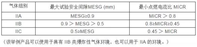 爆炸性氣體混合物的傳爆能力,標志著其爆炸危險程度的高低,爆炸性混合物的傳爆能力越大,其危險性越高。爆炸性混合物的傳爆能力可用最大試驗安全間隙表示。同時,爆炸性氣體、液體蒸汽、薄霧被點燃的難易程度也標志著其爆炸危險程度的高低,它用最小點燃電流比表示。II類隔爆型電氣設備或本質安全型電氣設備,按其適用于爆炸性氣體混合物的最大試驗安全間隙或最小點燃電流比,進一步分為IIA、IIB和IIC類。如下表所示。