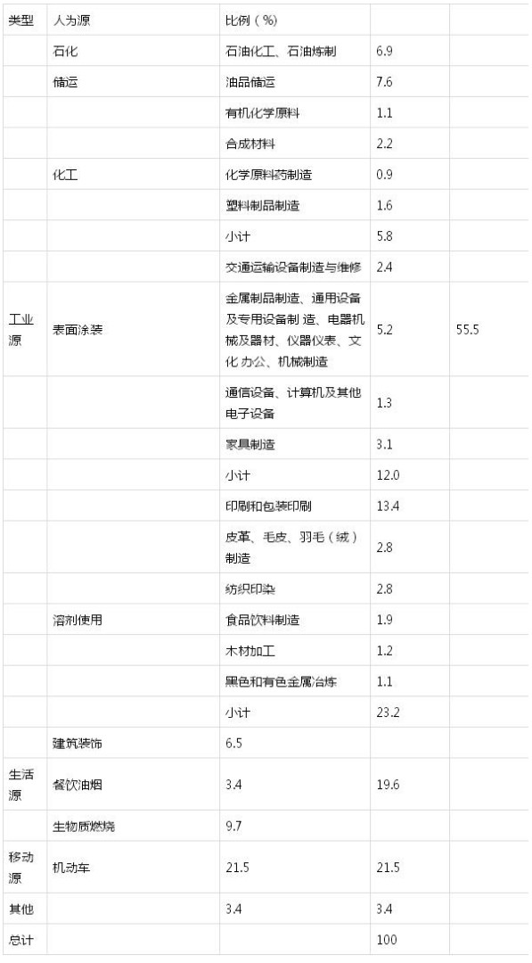 工業源VOCs排放涉及的行業眾多,目前缺乏權威認可的排放清單。2009年起環保部污控司組織中科院生態中心、清華大學、同濟大學、解放軍防化研究院、地質大學、華南理工大學等高等院校和科研院所中VOCs防治領域的專家對人為源排放情況進行估算。表1列出了估算的結果,其中工業源排放量占整個人為源的比重最高達55.5%,工業源中的重點工業行業包括石油煉制和儲運、化工、溶劑使用(包括表而涂裝)等。在工業源的四個產污環節中,含VOCs產品的使用過程環節排放最多,占整個工業源排放的60%以上,應予以重點控制。